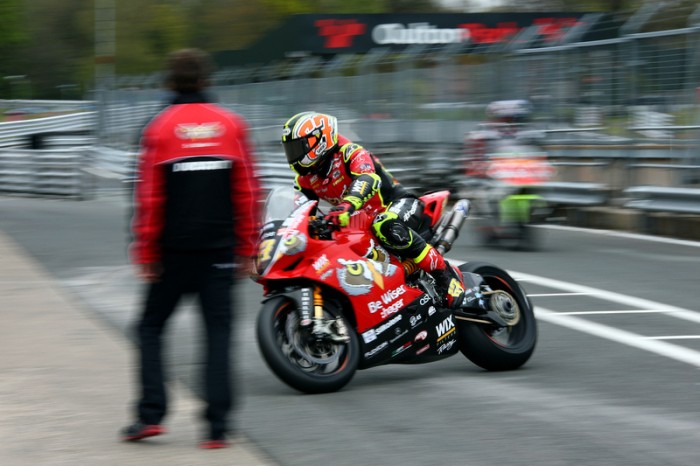 Be Wiser Ducati’s Shane Byrne clinched pole position after a well-timed fast lap, during the final MCE British Superbike qualifying session. On lap two the reigning champ clocked a 1’34.016 just before the rain started to fall on the Oulton Park circuit.