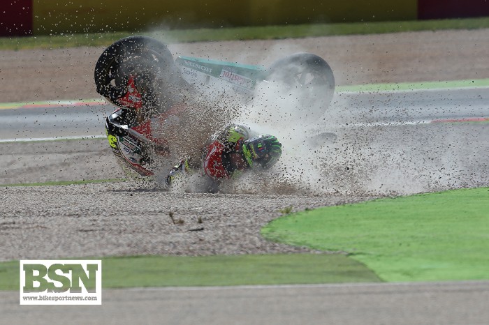 Britain’s Cal Crutchlow crashed out of yesterday’s Aragon MotoGP round after a late move on Johann Zarco but had been having problems with his front-brake setup all race.