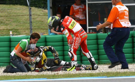 "It didn't work out that way though, because I got caught out by Toni Elias cruising for a tow. He let Andrea Iannone go past and then pulled right in front of me when I was on a fast lap. I tucked the front a few times trying to get the bike stopped, but there was no way I could avoid him and down we both went.