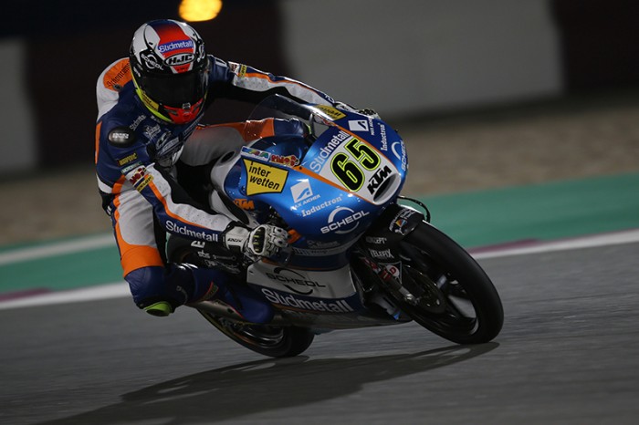 German Peter Oettl topped the Moto3 timesheets after two free practice sessions at the Qatar MotoGP round, setting the best time in the first session when track temperatures were higher and heading off a challenge from Joan Mir with Gabriel Rodrigo third but it was disaster for the youngster who broke his collarbone in a crash at the end of the opening period.